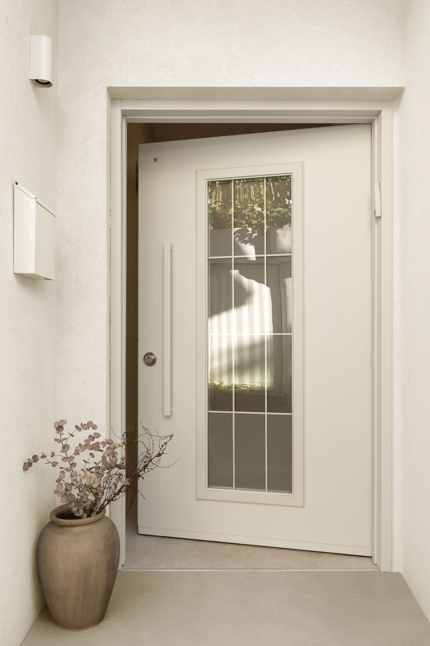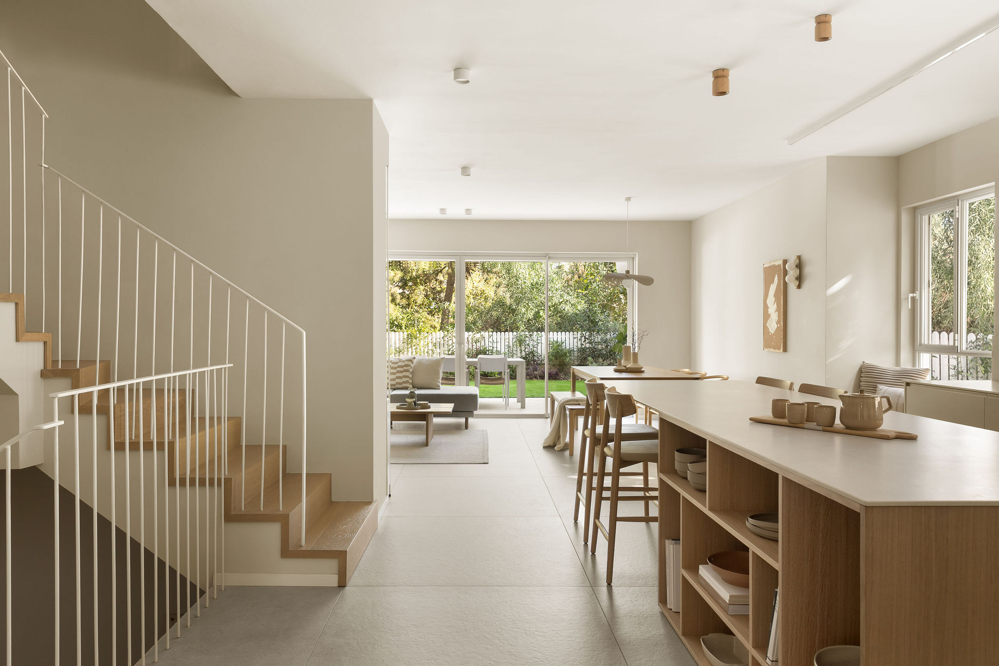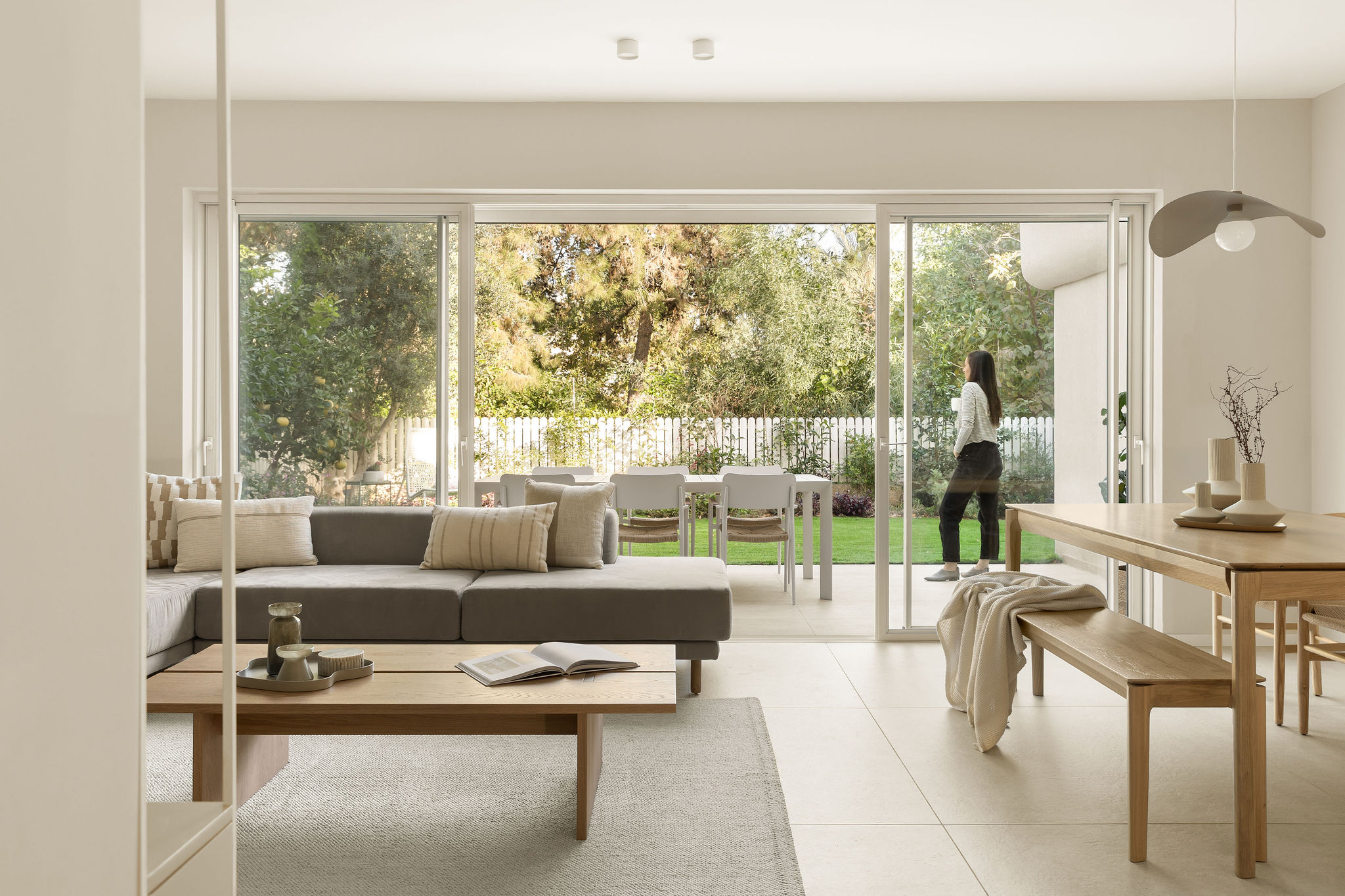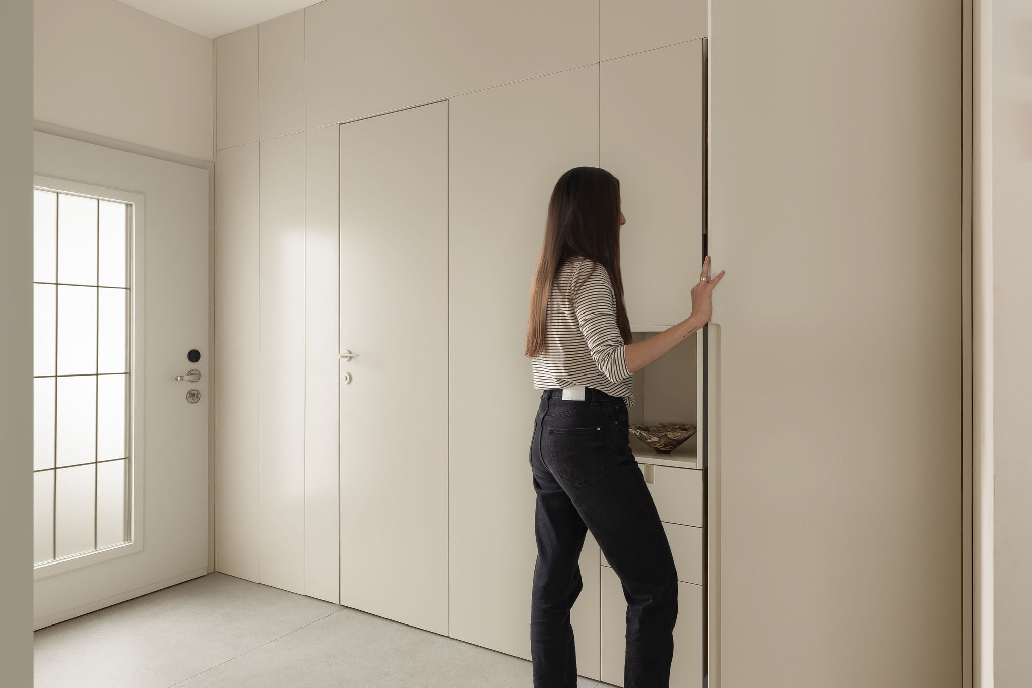 בתוך הבית נבחרו דלתות פנים ממגוון דגמים של רב־בריח, ביניהן דלת מדגם “פיור” בקו אפס עם משקוף עיוור, שחופתה כחלק אינטגרלי מקיר הכניסה והמשיכה באופן רציף לנגרות הסמוכה. בחללים פונקציונליים שולבו דלתות כיס, המאפשרות ניצול מיטבי של החלל תוך שמירה על ניקיון צורני. כלל הדלתות בגמר צבע בהיר ועדין, עם צירים נסתרים וחירוץ אורך מינימלי—פרטים שמדגישים את האיפוק והדיוק, ומאפשרים לדלתות להיות חלק שקט ואורגני מהשפה הכוללת של הבית.
