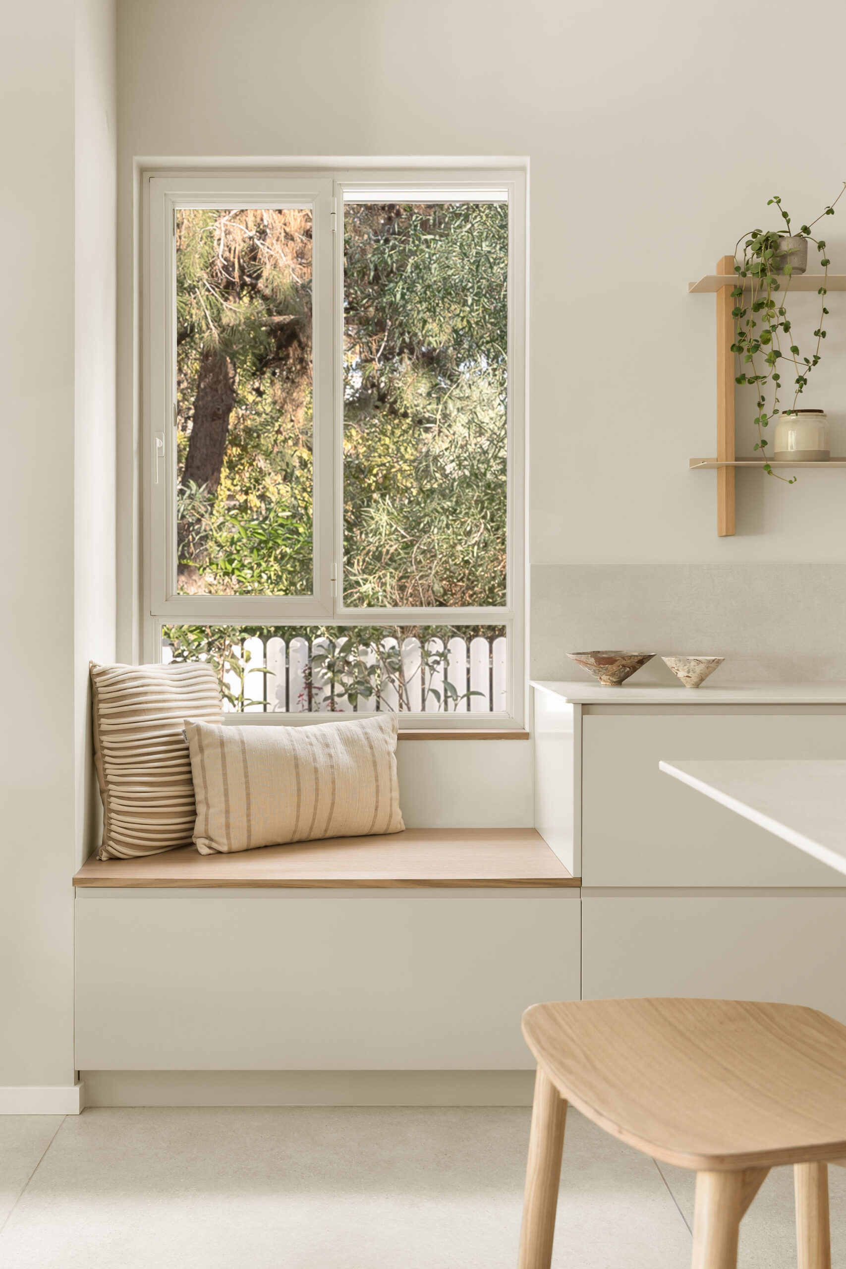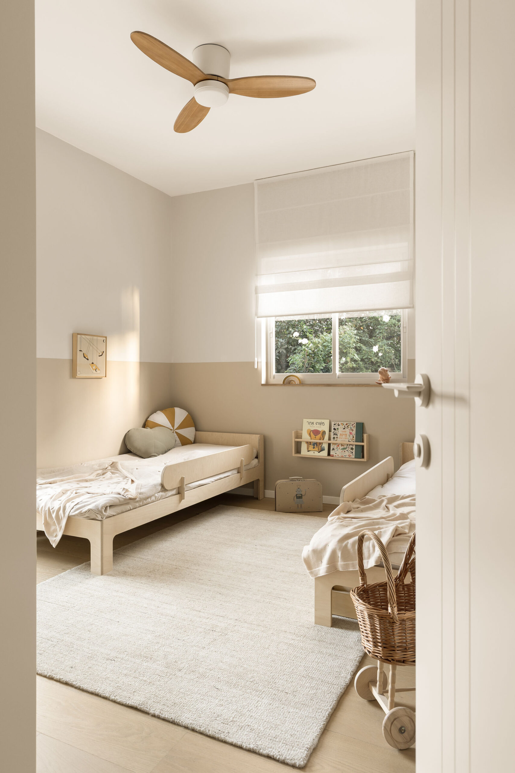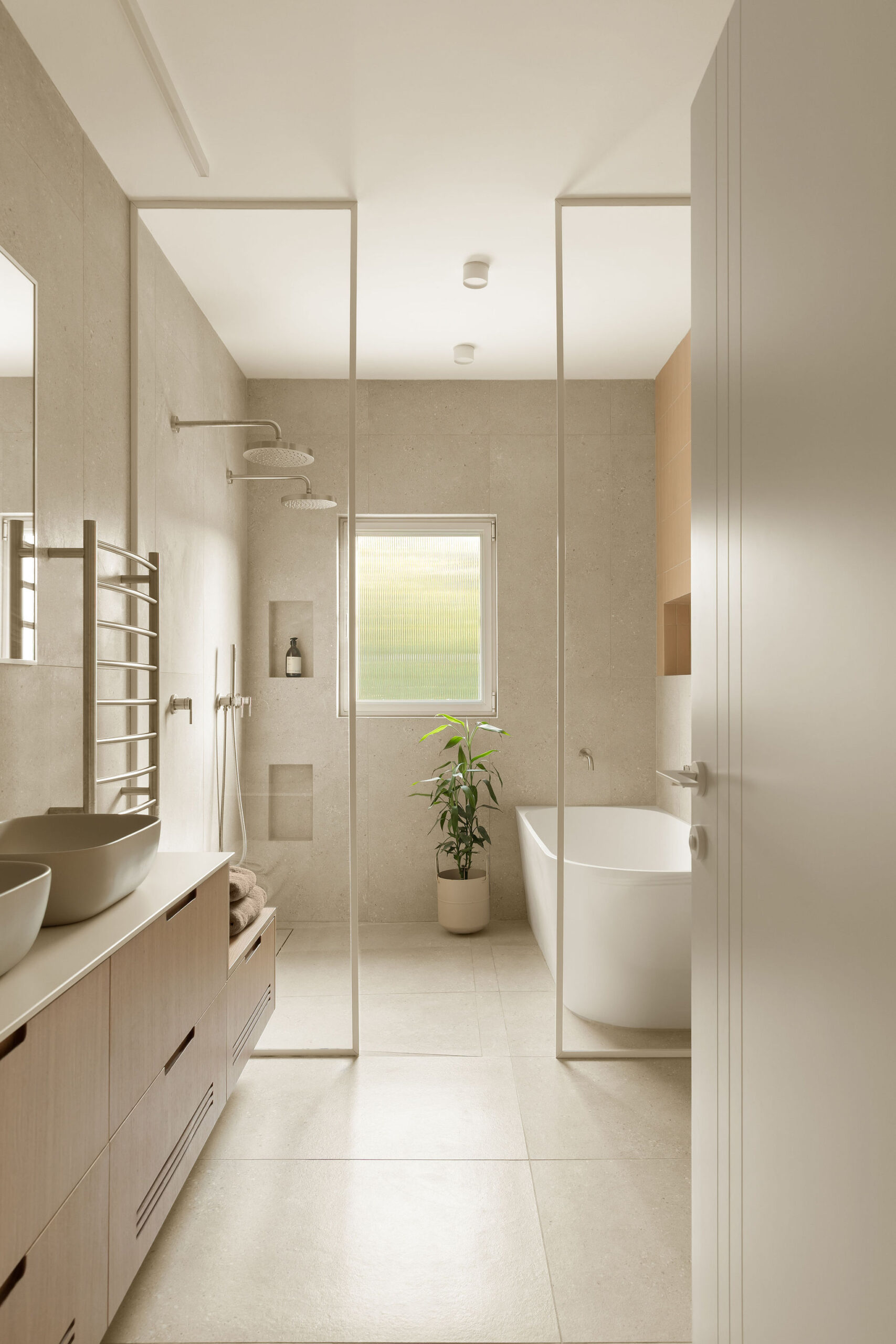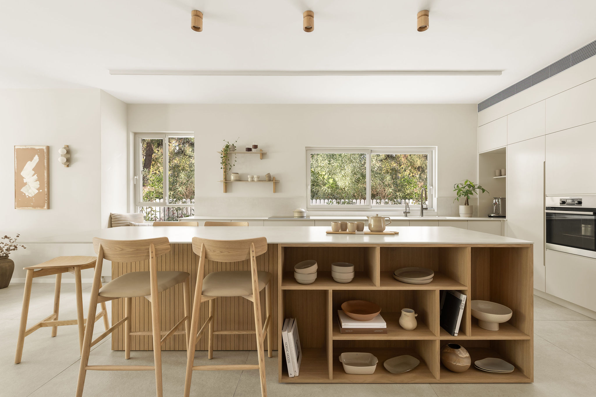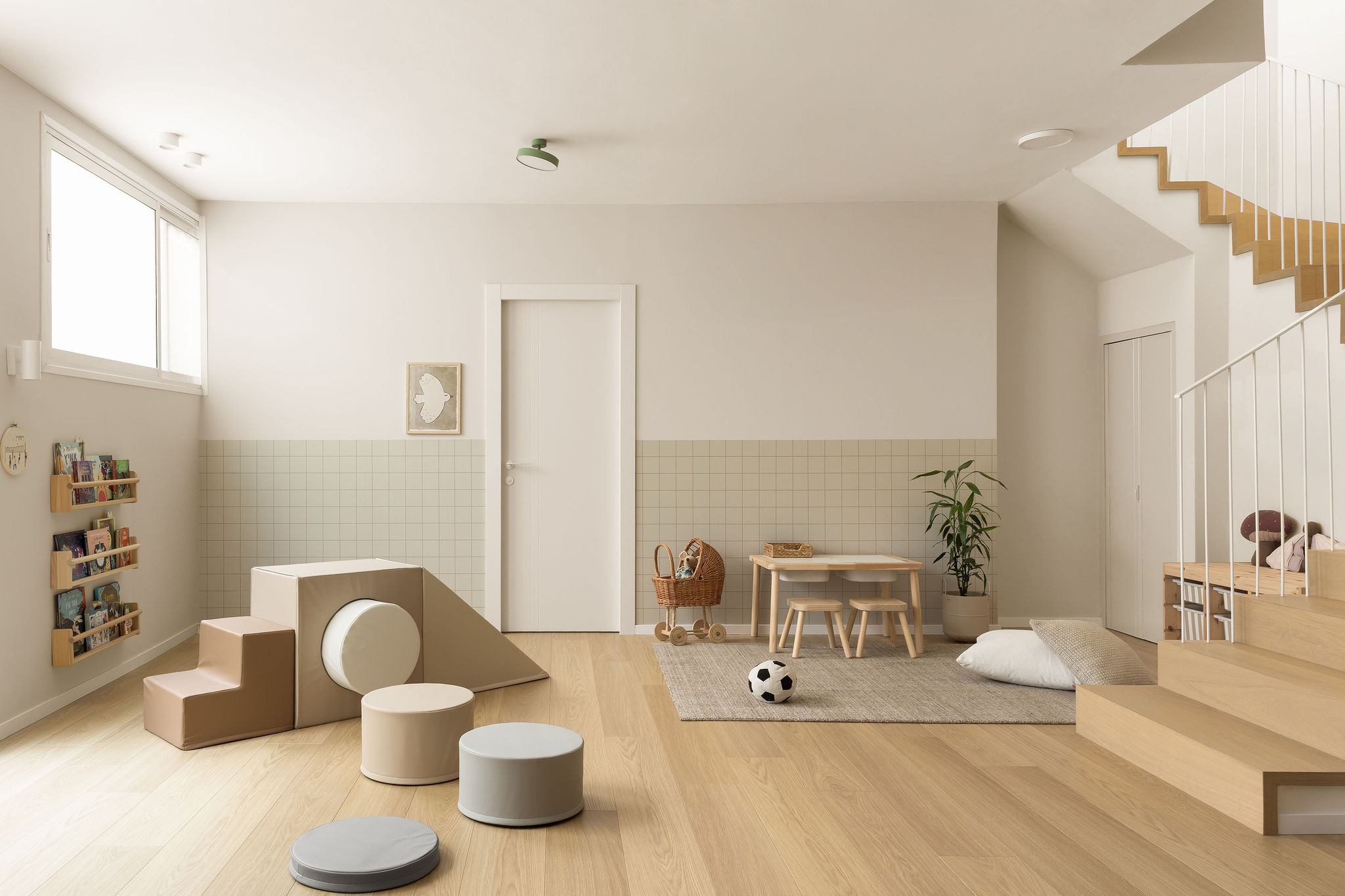 בתוך הבית נבחרו דלתות פנים ממגוון דגמים של רב־בריח, ביניהן דלת מדגם “פיור” בקו אפס עם משקוף עיוור, שחופתה כחלק אינטגרלי מקיר הכניסה והמשיכה באופן רציף לנגרות הסמוכה. בחללים פונקציונליים שולבו דלתות כיס, המאפשרות ניצול מיטבי של החלל תוך שמירה על ניקיון צורני. כלל הדלתות בגמר צבע בהיר ועדין, עם צירים נסתרים וחירוץ אורך מינימלי—פרטים שמדגישים את האיפוק והדיוק, ומאפשרים לדלתות להיות חלק שקט ואורגני מהשפה הכוללת של הבית.