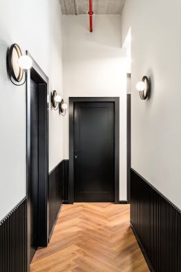 גם בתוך המשרד ממשיכה שפת העיצוב עם דלתות פנים שחורות, שמוסיפות נוכחות ואלגנטיות לכל חלל ושומרות על קו אחיד ומודרני.