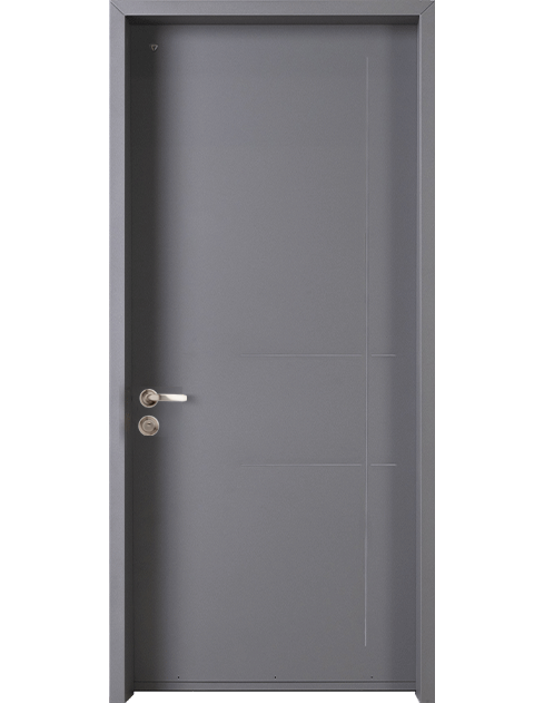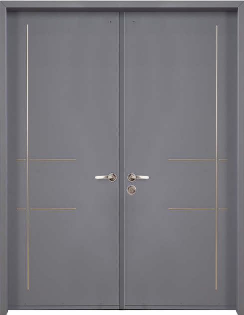 בגוונים בהירים החירוץ פחות בולט מאשר בגוונים כהים - דלת פלדה מגולוונת בגמר צבע ממניפת הגוונים, צירי פייפ או צירי HEAVY DUTY סמויים בתוספת תשלום. הדלת בעובי 1.25 מ"מ עם חיזוקי פלדה אורך ורוחב פנימיים בעלת הפחתת רעש DB30 עובי דלת 50 מ"מ • משקל הדלת כ- 50 ק"ג, הדלת מסופקת עם גומי אטימה היקפי, אינסרט תחתון טלסקופי לשליטה על גובה הדלת ומברשת תחתונה. משקוף בנייה מפלדה מגולוונת בעובי 1.5 מ"מ אשר מבוטן לקיר או משקוף כיסוי מותקן על גבי משקוף קיים.