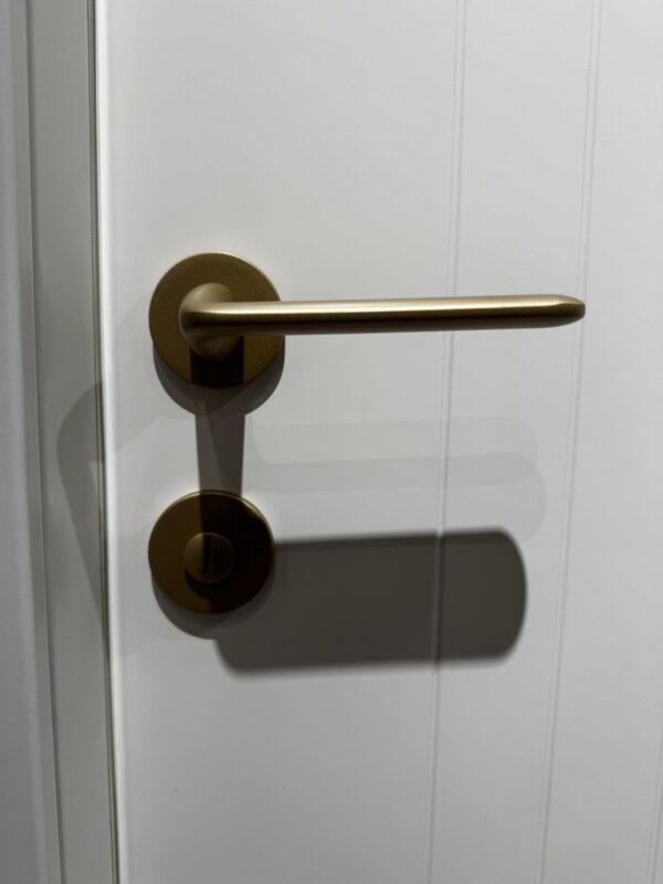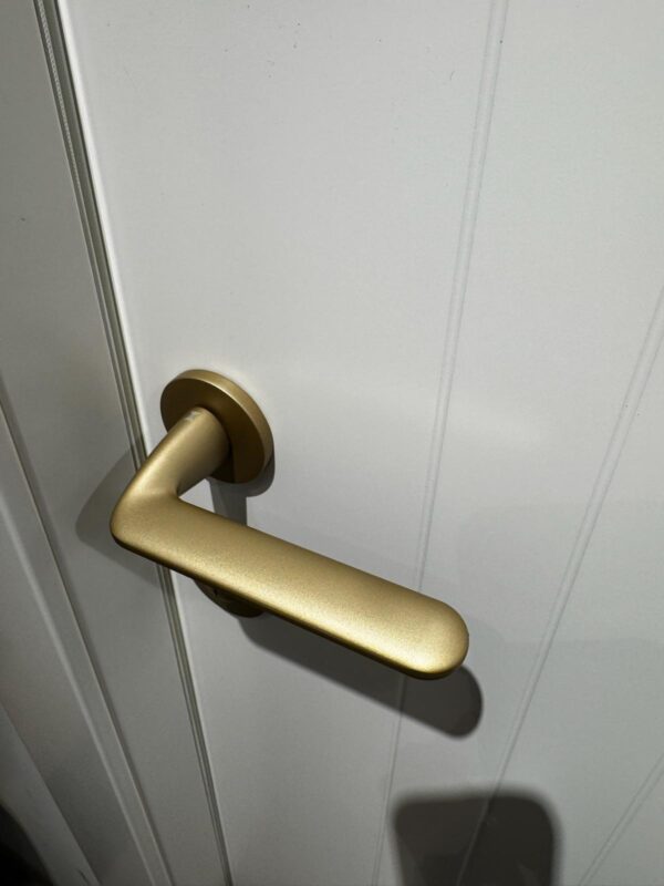 ידית לדלת פנים מדגם בורדו ברמת גימור יוקרתי ביותר ובגוון זהב מוברש בסגנון מודרני. הידית עם רוזטה עגולה.